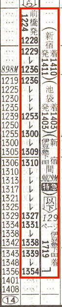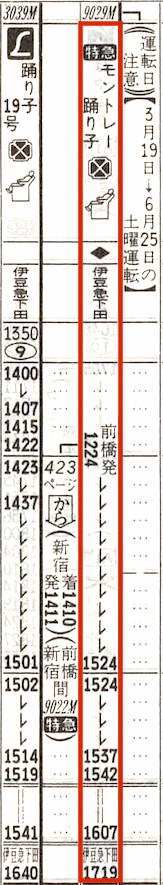前橋→伊豆急下田(土曜運転)と伊東→前橋(日曜運転)の臨時列車です。前橋・高崎から伊豆への観光需要があったのでしょう。前橋発は土曜の12時24分で、伊豆急下田へは17時19分の到着です。赤羽〜横浜は貨物線を通っていたようです。今の湘南新宿ラインと同じでしょうか。