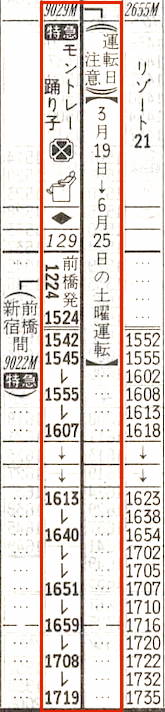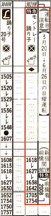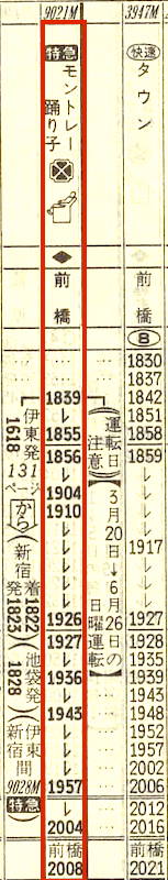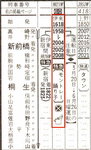 伊東発は日曜の16時18分ですから十分に伊豆観光を楽しめることでしょう。前橋着は20時08分です。なおモントレーとはフランス語で三つの山の意味で、上州の赤城山・榛名山・妙義山のことです。
