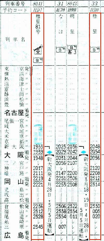 【臨時寝台特急彗星81号】8041:新大阪1933→2219岡山2221→0418門司0423→0619大分0620→1016宮崎【14時間43分】