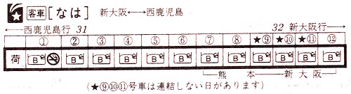 なはの列車編成です。全12両で、熊本〜西鹿児島は6両となります。禁煙車両はやはり1両のみです。