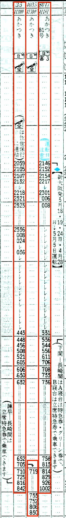 【寝台特急あかつき】35:新大阪2059→2321岡山2323→0605博多0606→0630鳥栖0632→0705☆肥前山口0710→0816諫早0817→0842長崎【11時間43分】、(4035)☆肥前山口0719→0830佐世保【11時間31分】
