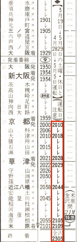 東京〜大阪の寝台急行銀河もあります。急行ですから特急よりも停車駅が多いです。22時45分に東京を出発すると、品川・横浜・戸塚・小田原・熱海・静岡・岐阜・米原・大津・京都に停車し大阪へは7時28分に到着します。