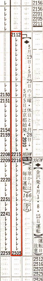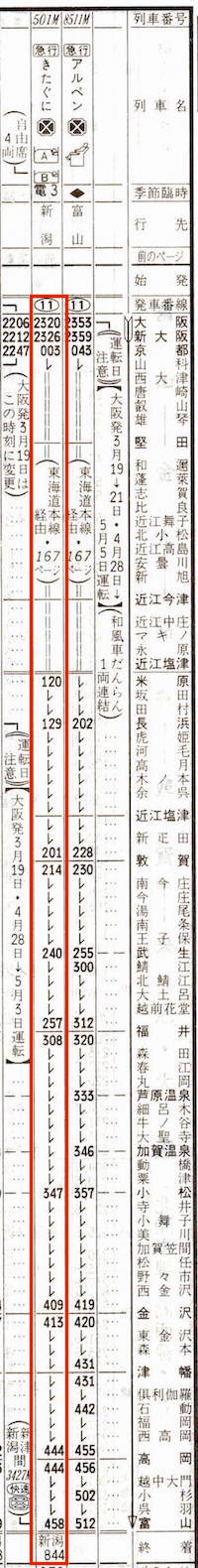 【臨時寝台急行ちくま85号】8803:大阪2315→2357京都2358→0430木曽福島0433→0516塩尻0518→0530松本0540→0717長野(8331快速)0718→0831妙高高原【9時間16分】【長野まで8時間02分】