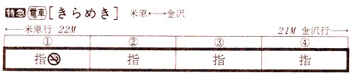 京都〜(米原経由)〜金沢の特急きらめきです。大阪・京都方面と北陸方面との連絡は湖西線が一般的なのですが、米原経由もまだ需要があったのでしょう。しかし京都〜米原は臨時列車で、米原〜金沢は毎日運転されます。京都を出ると、大津・草津・近江八幡・彦根・米原に停車し、北陸本線に入ります。