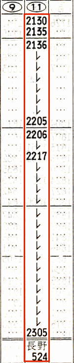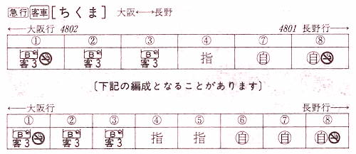 【臨時寝台急行ちくま83号】8801:大阪2240→2315京都2316→0018米原0020→0401木曽福島0402→0445塩尻0447→0500松本0505→0631長野【7時間51分】