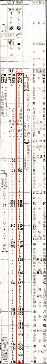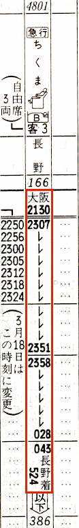 【寝台急行ちくま】4801:大阪2130→2205京都2206→2305米原2307→0028名古屋0043→0301木曽福島0304→0346塩尻0348→0401松本0412→0524長野【7時間54分】