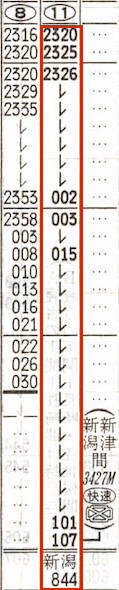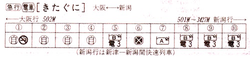 【寝台急行きたぐに】501M:大阪2320→0002京都0003→0107米原0120→0409金沢0413→0458富山0500→0632直江津0633→0730長岡0732→0820新津(快速3427M)0828→0844新潟【9時間24分】