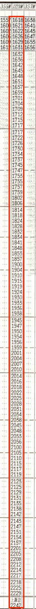 【普通】1223M:豊橋1618→1717本長篠1717→1806中部天竜1814→1938天竜峡1945→2010飯田2014→2119駒ヶ根2123→2217辰野2218→2242上諏訪【6時間24分】