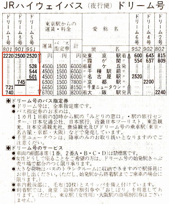 JRハイウェイバスの夜行便はドリーム号となります。東京ー名古屋・京都・大阪が設定されています。ドリーム号とはその名の通りに夢のある名前です。しかし、この頃からJRの寝台列車は徐々に姿を消し、夜行バスが数を増してきています。JRにとってドリームだったのでしょうか?
