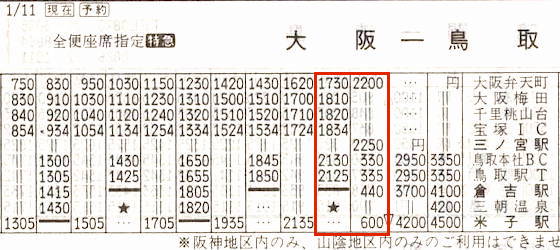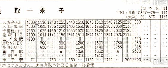 【大阪ー米子】大阪弁天町2200→0335鳥取駅ターミナル→0440倉吉駅→0600米子駅【8時間】日本交通