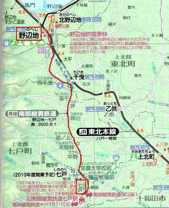 ここから私鉄です。廃止された私鉄を中心に取り上げてみます。まずは東北本線の野辺地から七戸の南部縦貫鉄道です。5往復の列車があります。以前から経営困難でしたが、東北新幹線青森延伸の際、設置される七戸十和田駅への乗り入れにより経営改善を期待してなんとか存続していました。しかし1997年に休止となり2002年に正式に廃止となりました。