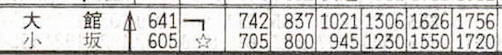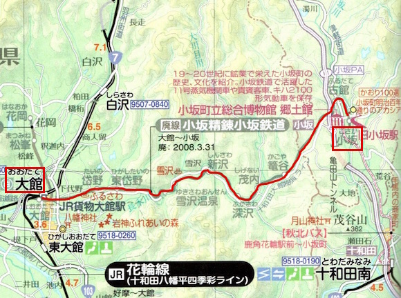 奥羽本線の大館と小坂を結ぶ同和鉱業小坂線です。小坂鉱山の鉱石輸送が主な目的で開設されました。7往復の列車があります。1994年に旅客営業が廃止となり、2009年に貨物輸送も廃止となりました。
