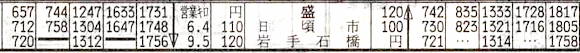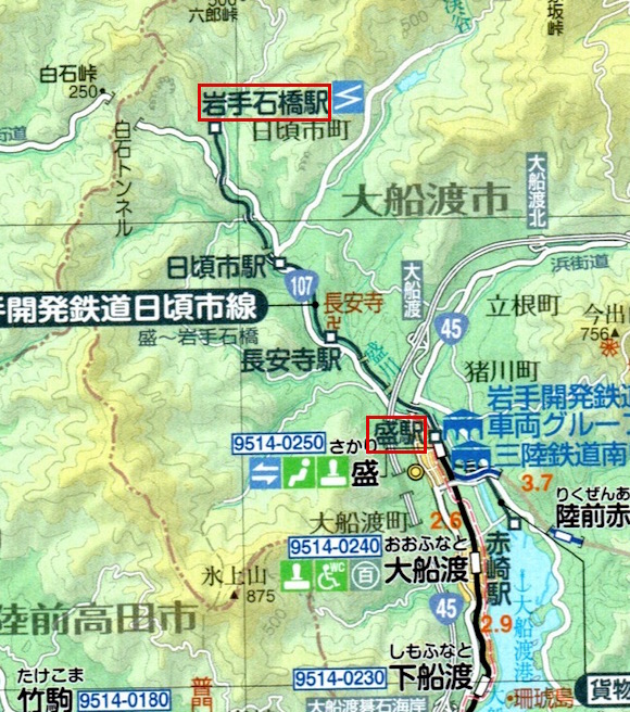 大船渡線・三陸鉄道南リアス線の盛から岩手石橋までの岩手開発鉄道です。釜石線の平倉までの延伸計画がありましたが実現しませんでした。盛〜岩手石橋3往復、盛〜日頃市2往復の列車があります。石灰石の輸送の貨物鉄道としては現在も稼働しています。旅客営業は1992年に廃止となりました。