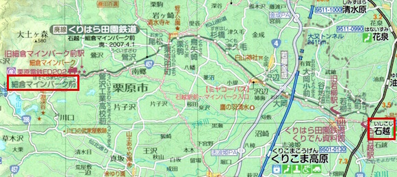 東北本線の石越から細倉(その後細倉マインパーク前に改称)までの栗原電鉄です。13往復の列車があります。細倉鉱山からの鉱石輸送が主体でした。しかし1986年に細倉鉱山が閉山し、旅客営業も急速に悪化したため、1995年に電車から気動車に切り替え第三セクターのくりはら田園鉄道となりました。「くりでん」の愛称で親しまれていたため、電気運転を廃止しても愛称を残すために「田園」の文字を社名に入れたようです。残念ながら、2007年に廃止になりました。