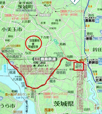常磐線の石岡から鉾田までの鹿島鉄道です。20往復の列車があります。近くにある航空自衛隊百里基地(現茨城空港)への燃料の貨物輸送が主体でしたが2001年に燃料輸送が終了し、深刻な経営悪化となり、2007年に廃止になりました。