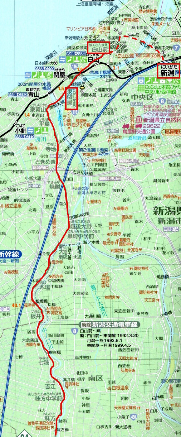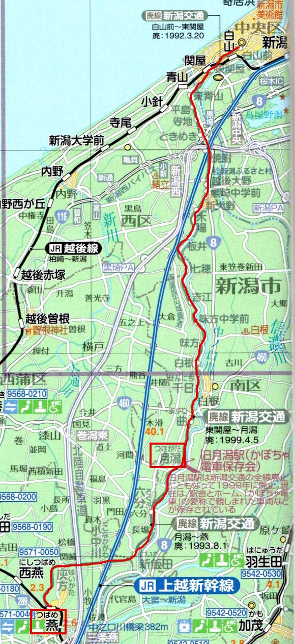 弥彦線の燕から白山前を結ぶ新潟交通です。20往復の列車があり、他に区間運転もあるようです。白山前から万代橋を通り新潟駅まで延伸する計画がありましたが、実現しませんでした。1992年に軌道線の白山前〜東関屋が廃止となり、ついで1993年に燕〜月潟、1999年に月潟〜東関屋が廃止となりました。