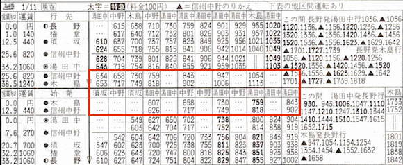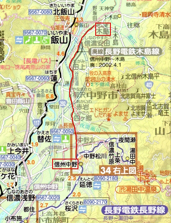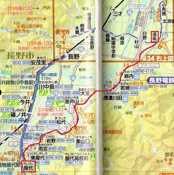 信越本線の長野と湯田中・屋代(信越本線)・木島を結ぶ長野電鉄です。長野〜須坂〜信州中野〜湯田中が長野線、須坂〜屋代が屋代線、信州中野から木島が木島線です。2002年に木島線が、2012年に屋代線が廃止になりました。