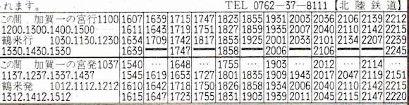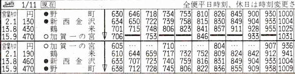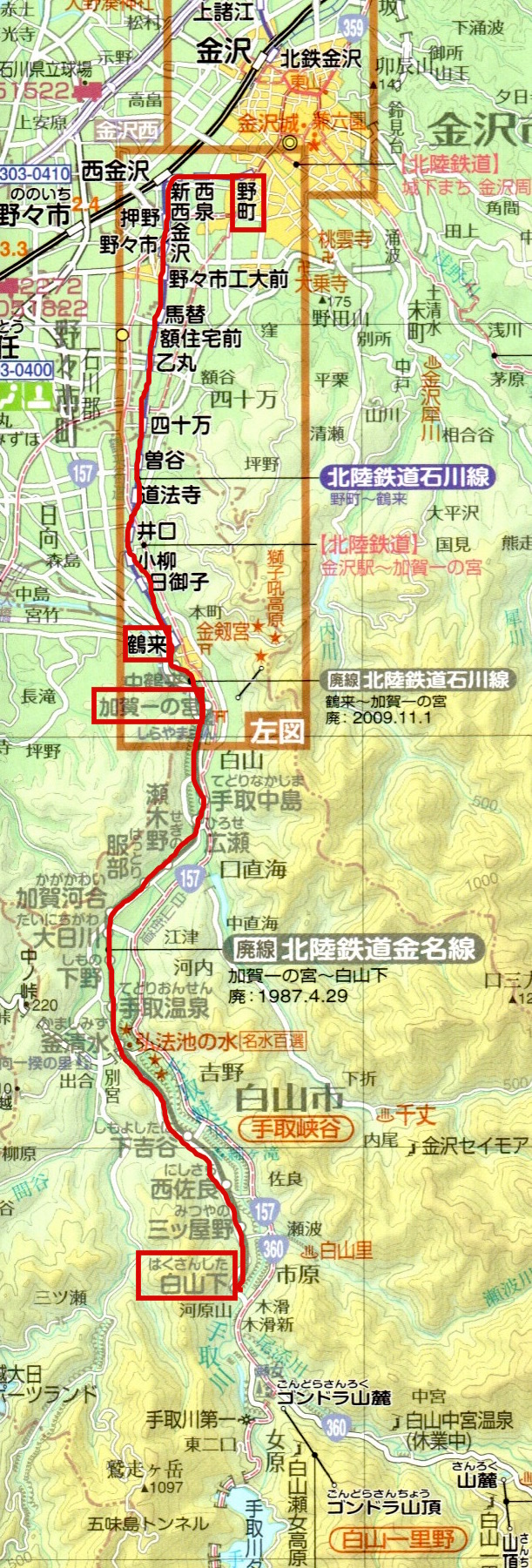 野町と加賀一の宮を結ぶ北陸鉄道石川線です。途中の新西金沢で北陸本線の西金沢に接続しています。1年前の1987年までは加賀一の宮〜白山下まで路線が伸びていました。野町〜加賀一の宮16往復、野町〜鶴来18往復の列車が走っています。鶴来〜加賀一の宮の区間は2009年に廃止されました。