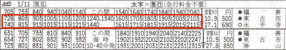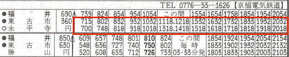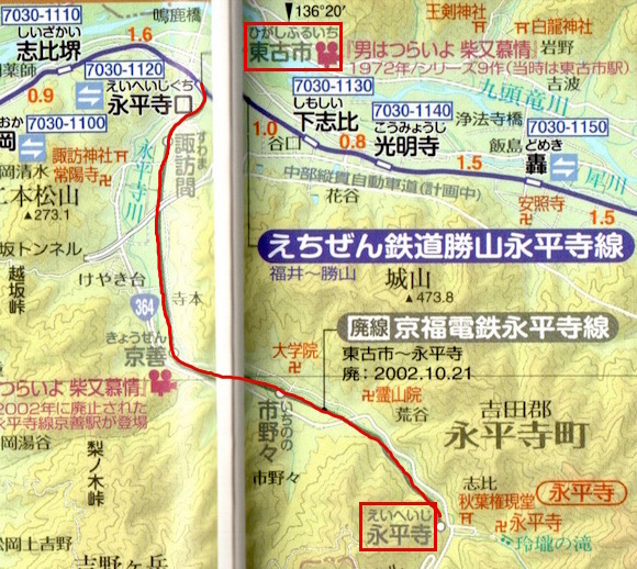 東古市と永平寺を結ぶ京福電気鉄道永平寺線です。東古市(現:永平寺口)は越前本線の途中駅で、列車運行は福井〜東古市〜永平寺と越前本線に乗り入れており、15往復の列車があります。2002年に廃止されました。