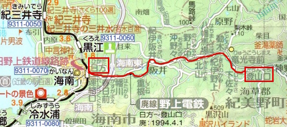 紀勢本線海南駅の近くの日方(ひかた)と登山口を結ぶ野上電気鉄道です。23往復の列車があります。地元の特産品を港のある日方へ運ぶために、紀勢本線より前に開業しています。しかし1994年に廃止されました。