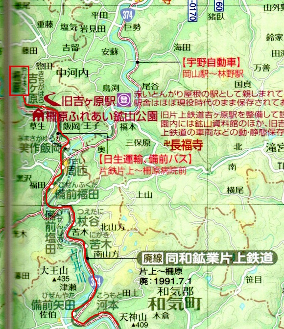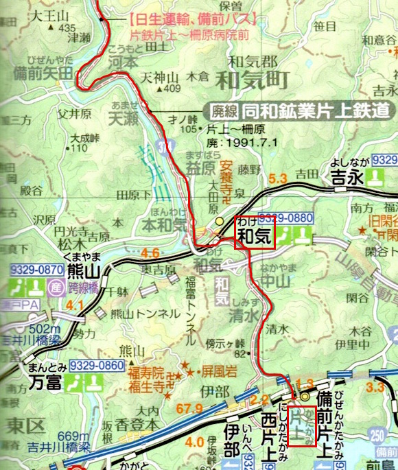片上と柵原(やなはら)を結ぶ同和鉱業片上鉄道です。途中の和気で山陽本線に接続しています。柵原鉱山の硫化鉄鉱を片上港まで運ぶ目的で建設されました。8往復ほどの列車があります。1988年に貨物営業を廃止し、1991年に全線廃止になりました。