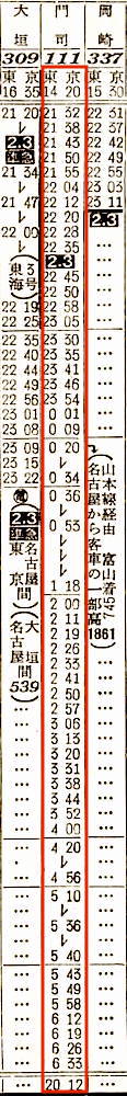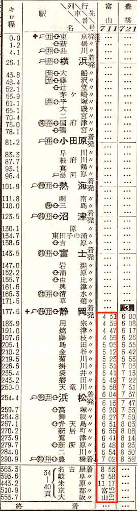 東京14時20分発の普通列車の行き先はなんと門司です。横浜7分、沼津11分(準急東海2号の到着待ち)、富士6分、静岡6分、浜松7分停車し、豊橋には21時30分に到着します。普通列車ですが、大磯、二宮、鴨宮、早川、根府川、真鶴は通過します。
