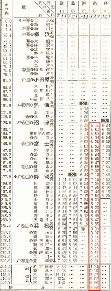 東海道本線の昼行の特急はこの頃は4本あります。この11月1日から誕生したビジネス特急のこだまに注目です。特急第1こだまは東京7時ちょうど発で、横浜に停車した後、名古屋まで停車しません。