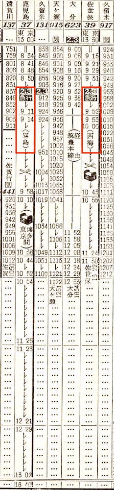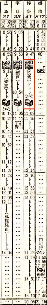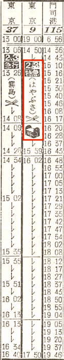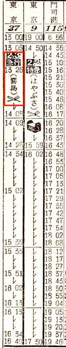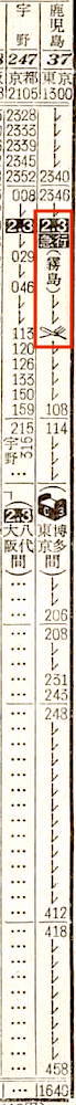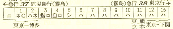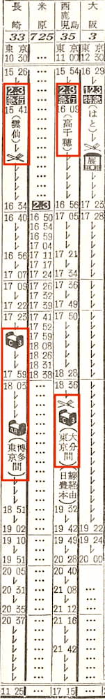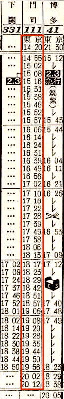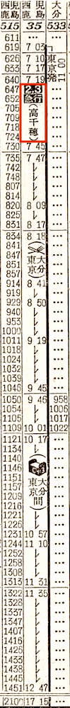【寝台急行高千穂】35:東京1100-(東海道本線)-2112神戸2116-(山陽本線)-0703門司0710-(鹿児島本線)-0717小倉0719-(日豊本線)-1715西鹿児島【30時間15分】