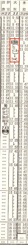 東京9時30分発の大阪行きの急行なにわです。東京を出ると、品川、横浜、大船、小田原、湯河原、熱海、三島、沼津、富士、清水、静岡、島田、浜松と13駅にこまめに停車し、豊橋には14時21分に到着します。