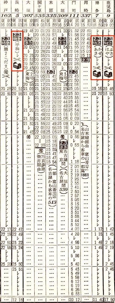 東京発九州方面の寝台特急には、平和・あさかぜ・はやぶさがあります。東京16時05分発の長崎行きの寝台特急平和(10月にさちかぜから改称)は、横浜に停車し、名古屋まで停まりません。東京18時30分発の博多行き寝台特急あさかぜ(10月に固定編成化)は、横浜、熱海、浜松に停車します。東京19時ちょうど発の鹿児島行きの寝台特急はやぶさ(10月に新設)は、横浜、静岡に停車します。