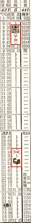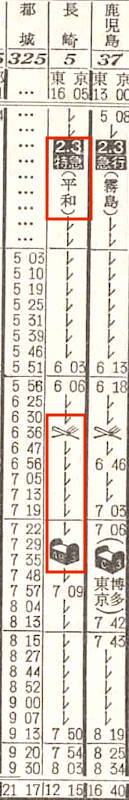 【寝台特急平和】5:東京1605-(東海道本線)-2350神戸2351-(山陽本線)-0803門司0807-(鹿児島本線)-鳥栖(通過)-(長崎本線)-1215長崎【20時間10分】