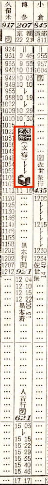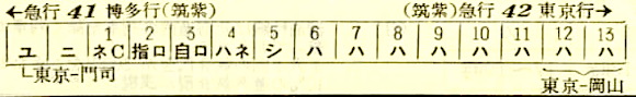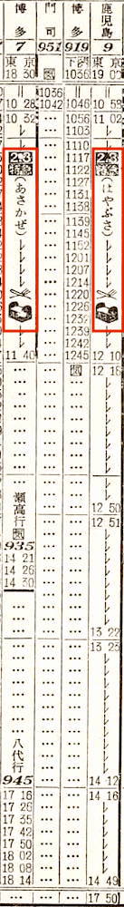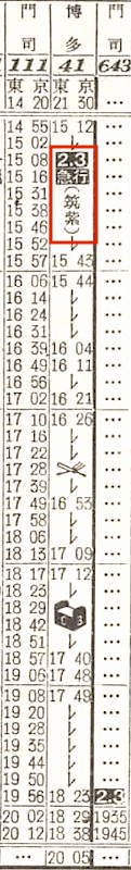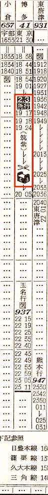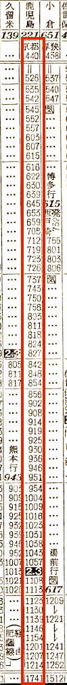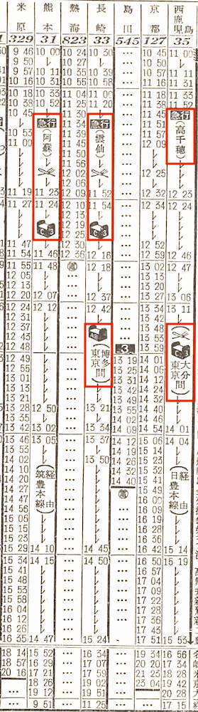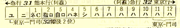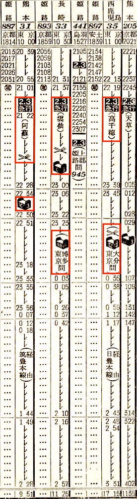 【寝台急行阿蘇】31:東京1000-(東海道本線)-1950神戸1953-(山陽本線)-0546門司0653-(鹿児島本線)-折尾(通過)-(筑豊本線)-0744原田0744-(鹿児島本線)-0951熊本【23時間51分】