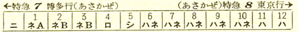 阿蘇は、全12両で、2等寝台車1両、2等車2両(指定席1両、自由席1両)、3等寝台車1両、3等車7両、食堂車1両で、郵便車と荷物車が各1両設置されています。3等車のうち2両は門司で切り離されます。