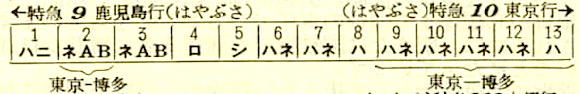 はやぶさは、全13両で、2等寝台車(ネAB)2両、2等車(ロ)1両、3等寝台車(ハネ)6両、3等車(ハ)3両、食堂車(シ)1両です。博多で6両切り離し、博多-鹿児島は7両です。