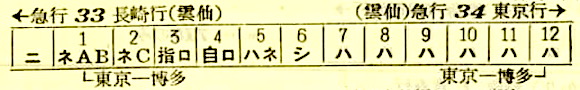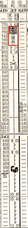 【寝台急行雲仙】33:東京1030-(東海道本線)-2035神戸2037-(山陽本線)-0631門司-(鹿児島本線)-0837鳥栖0848-(長崎本線)-1125長崎【24時間55分】