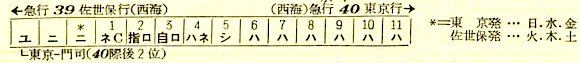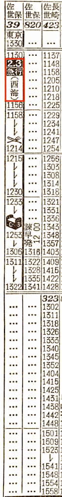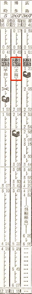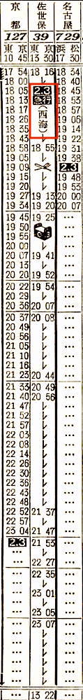 東京を13時30分発の寝台急行西海は佐世保行きです。東京を出ると、霧島の停車駅に富士、清水を加えた10駅に停車し、豊橋には18時15分に到着します。