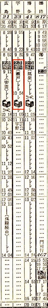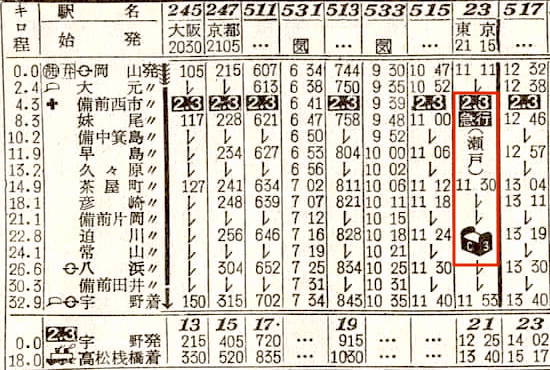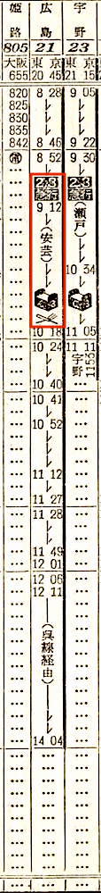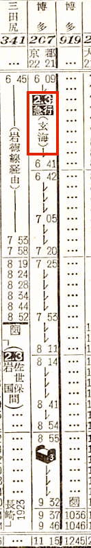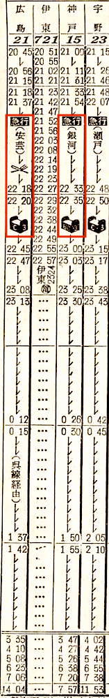 西海と霧島は、ともに姫路、岡山、福山、尾道、糸崎、広島と6駅に停車し、岩国には西海は5時34分に、霧島は4時58分に到着します。