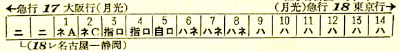 他にも長距離夜行普通列車がありました。大阪16時35分発の東京行きです。京都12分、米原12分(北陸本線普通列車連絡待ち)、名古屋10分停車し、豊橋には22時44分に到着します。