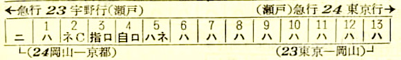 東京10時30分発の寝台急行雲仙は長崎行きです。東京を出ると、前述の阿蘇の停車駅に焼津を加え10駅に停車し、豊橋には15時24分に到着します。