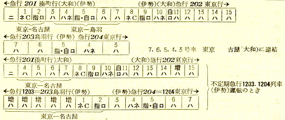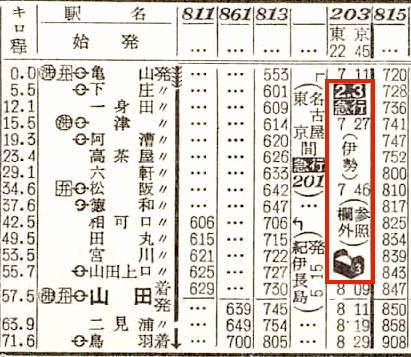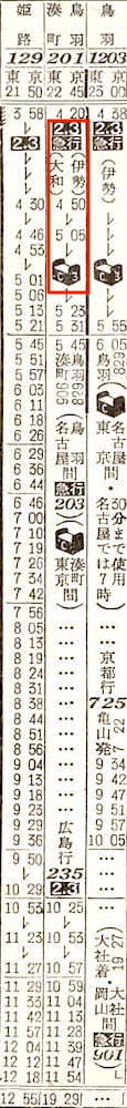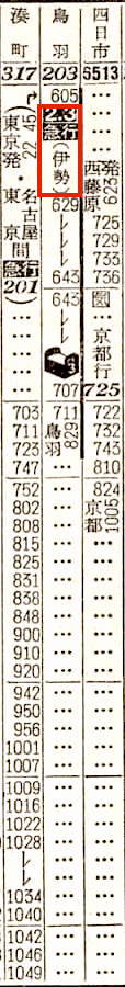 【寝台急行伊勢】201:東京2245-(東海道本線)-0531名古屋☆0605-(関西本線)(203)-0829鳥羽【9時間44分】