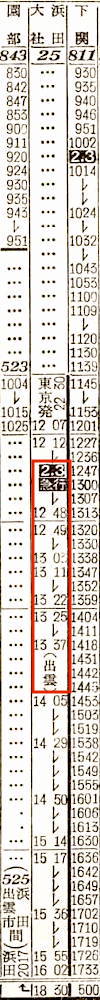【寝台急行出雲】25:東京2230-(東海道本線)-0922大阪0940-(福知山線)-1207福知山1212-(山陰本線)-1813出雲市☆1835-(525)-2008浜田【21時間38分】