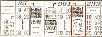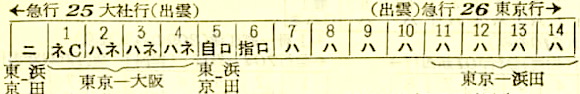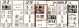【寝台急行出雲】25:東京2230-(東海道本線)-0922大阪0940-(福知山線)-1207福知山1212-(山陰本線)-1813出雲市☆1820-(大社線)-1830大社【20時間00分】