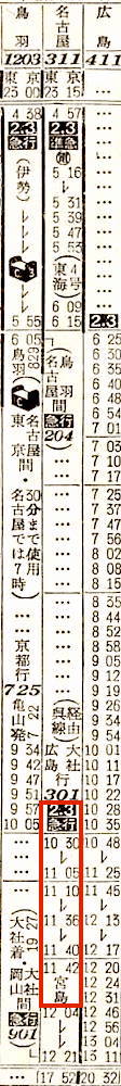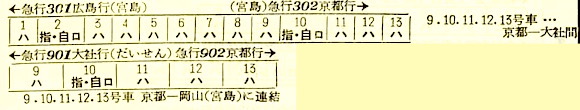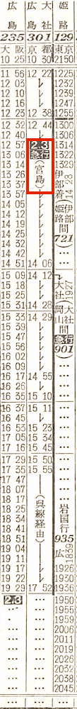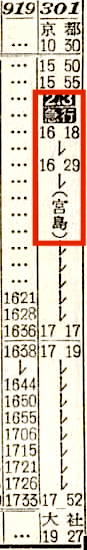 【急行宮島】301:京都1030-(東海道本線)-1140神戸1142-(山陽本線)-1406岡山☆1412-(山陽本線)-1555三原1555-(呉線)-1752広島【7時間22分】
