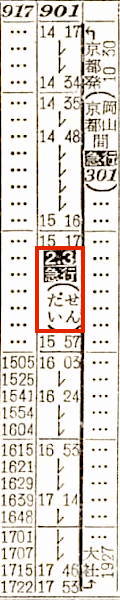 【急行だいせん】301:京都1030-(東海道本線)-1140神戸1142-(山陽本線)-1406岡山☆1417-(伯備線:901)-1753米子1800-(山陰本線)-1916出雲市1917-(大社線)-1927大社【8時間57分】