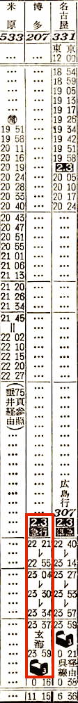 【寝台急行玄海】207:京都2221-(東海道本線)-2334神戸2337-(山陽本線)-0946門司0953-(鹿児島本線)-1115博多【12時間54分】