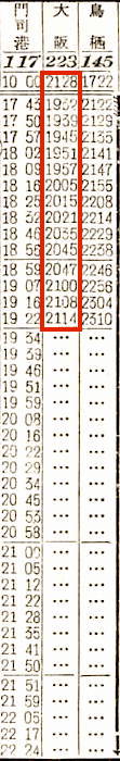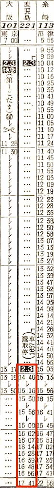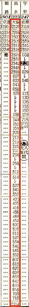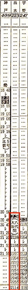 【普通】223:大阪2128-(東海道本線)-2200神戸2204-(山陽本線)-1220門司1232-(鹿児島本線)-2114出水【23時間46分】