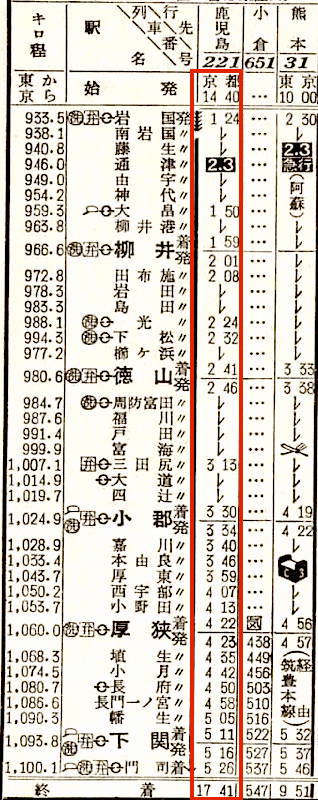 【普通】221:京都1440-(東海道本線)-1600神戸1602-(山陽本線)-0526門司0535-(鹿児島本線)-1741鹿児島【27時間01分】