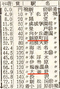 小田急線の料金は、新宿-小田原170円(900円)、新宿-伊勢原120円(600円)、新宿-相模大野80円(380円)です。カッコ内は2022年の料金です。そして、新原町田(町田)、大秦野(秦野)などの駅もあります。カッコ内は現在の駅名です。
