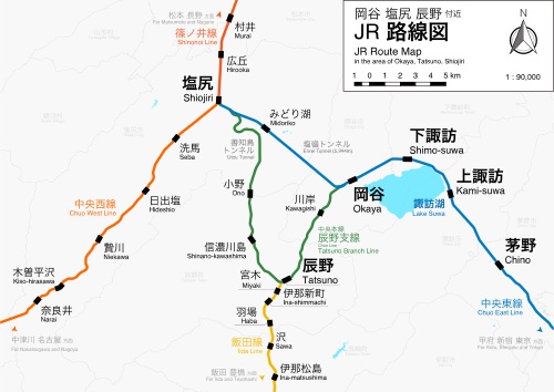 現在の辰野駅周辺の地図です。岡谷-みどり湖-塩尻に短絡線ができています。岡谷-塩尻間は、辰野経由で27.7 km、みどり湖経由で11.7 kmです。