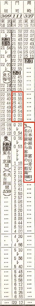 この列車は不思議です。どうして名古屋-岐阜を連結しているのでしょうか? 門司行きの列車に名古屋で連結してからわずか30分あまりの岐阜で分離しています。作業の手間を考えると、名古屋から独立した列車として運行した方が良いのではないでしょうか? また、門司行きの列車から富山行きの列車に乗り換える乗客にとっても、名古屋で乗り換えるか岐阜で乗り換えるかの違いしかありません。機関車や客車の運用の都合なのでしょうか? 不思議な運行です。